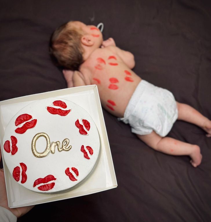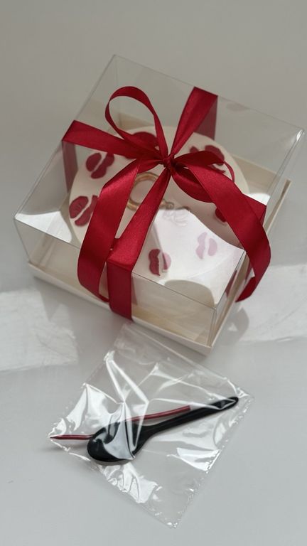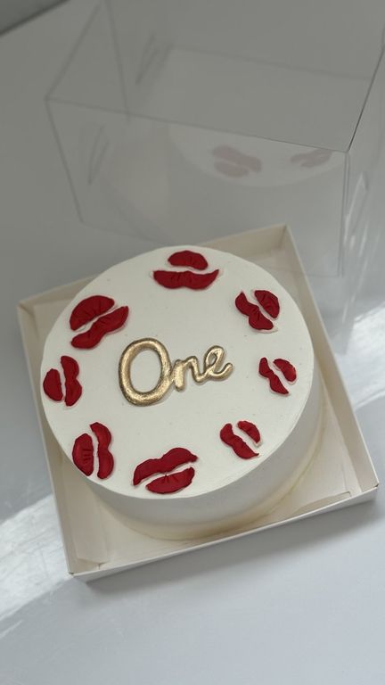 Нежный и стильный мини-торт, украшенный яркими алыми поцелуями и надписью “One” в золотом цвете. Этот бенто-торт станет идеальным выбором для первого юбилея.